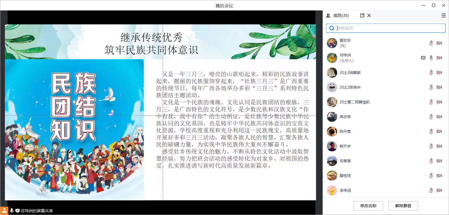 为铸牢中华民族共同体意识,弘扬优秀传统民族文化,凝聚各民族情谊,营造校社共育、共乐的良好氛围,根据《自治区教育厅关于开展2024 年“广西三月三”民族团结进步宣传月活动的通知》 (桂教民政〔2024〕3 号)要求,公司结合实际情况,开展了2024年民族团结进步宣传月主题班会。
