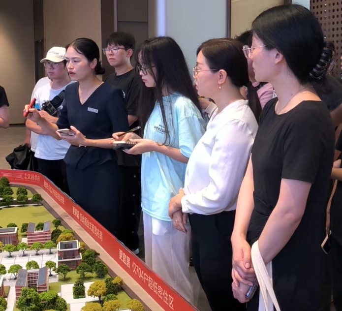 第三站,师生们来到了万丰新新传奇项目售楼部。置业顾问为同学们详细介绍了项目区位、沙盘和户型等内容,同学们提出了自己的疑问,置业顾问耐心地解答,还带领同学们仔细研究了不同户型,同学们还参观不同户型不同风格的样板房,并化身为“房产经纪人”,真人出镜拍摄房产短视频为客户讲解样板房。