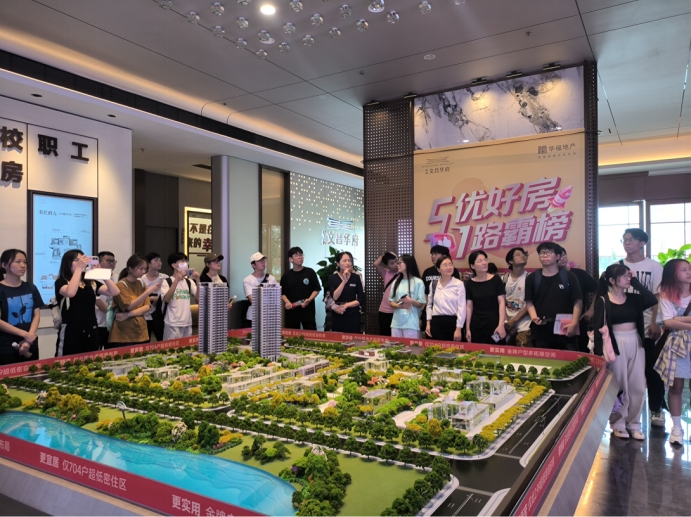 第二站,对华福文昌华府项目进行踩盘,同学们得到了售楼部领导及韦经理的热情接待,从中学到了与客户交谈的沟通技巧和服务态度,积累了相关经验。韦经理为同学们讲解了企业品牌、项目区位、沙盘、户型等内容,带领同学们参观异地样板间和实体样板间,沉浸式体验华福文昌华府项目的蝶式产品,力推主力户型98m²(四房两厅两卫且双阳台户型)。同学们在样板间拍摄房产短视频,同学们虚心地向房产抖音网红主播韦经理请教,期盼学到更多房产新媒体营销的知识和技能。