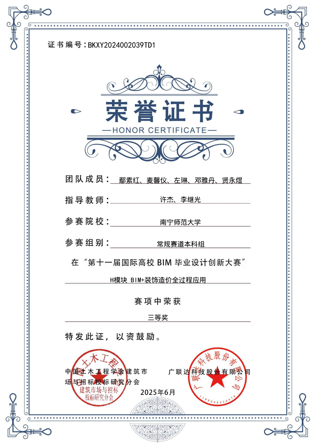第十一届国际高校BIM毕业设计创新大赛是教育部认证的A类赛事,本次大赛共计报名700余家国内院校,10余家国外院校,14000余支团队,参与师生80000余人,共计提交作品4400余份。公司3支队伍均在此次大赛中表现出色。22级房地产开发与管理专业的陈欣怡、奚经透、谢方冰、黄顺美、宁雪梅等十五位参赛队员利用课余时间仔细研究比赛规则和相关要求,分工明确、各司其职、紧密配合。面对比赛中遇到的困难,他们迎难而上,相互交流、共同探讨,不断对作品进行优化改善。在备赛过程中,凌恺、许杰、娄信强老师对员工们的作品认真地给予指导,定期组织小组会议,以此打磨出更高质量的参赛作品,优化建模和PPT。经过长达四个月的精心准备,2025年4月9日,3支队伍在比赛官网提交了最终参赛作品。经过1000余位院校及企业专家进行线上综合评分,公司参赛队伍喜获佳绩。