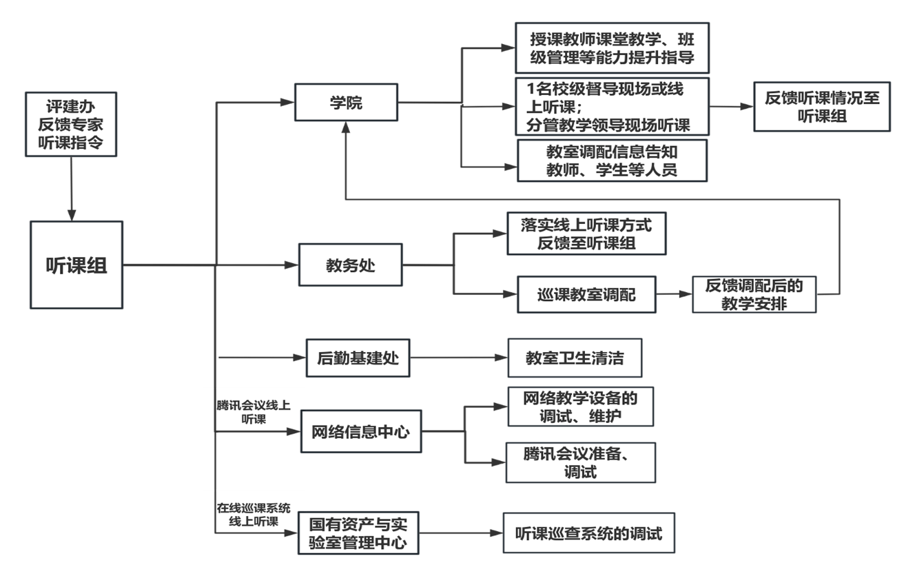 (三)负责确定听课方式,如使用腾讯会议则由网络信息中心专家对应技术人员负责安装调试(责任人:陆伟杰);如使用在线巡课系统则国有资产与实验室管理中心做好巡课教室的调配(责任人:李峙);相应单位及时把听课方式及相关信息反馈至听课组联络员处。责任人:谢统义、邓敏